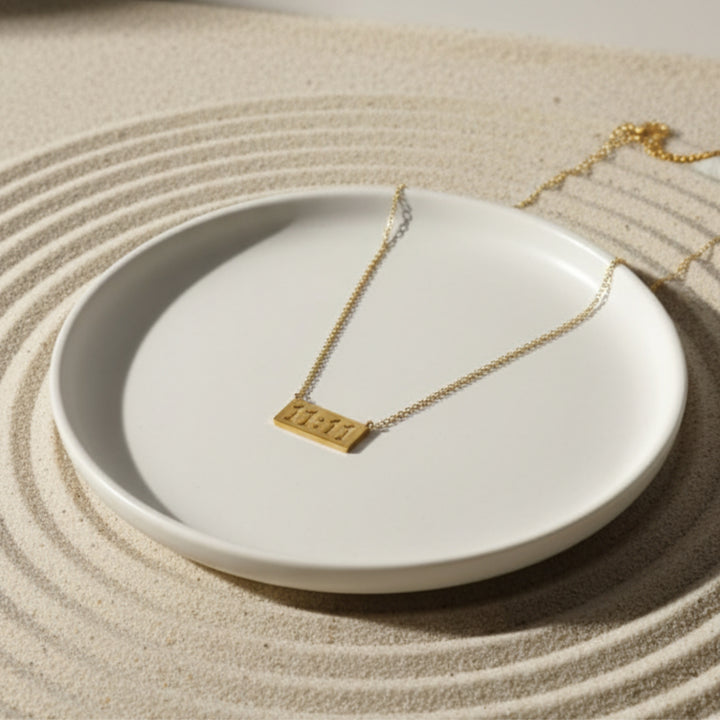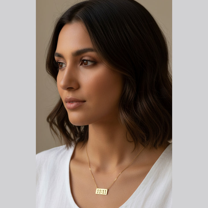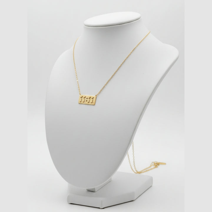 Elegant 1111 Angel Number Necklace symbolizing manifestation and positive energy. Gold-plated pendant on a sleek chain, perfect for daily wear or gifting. |