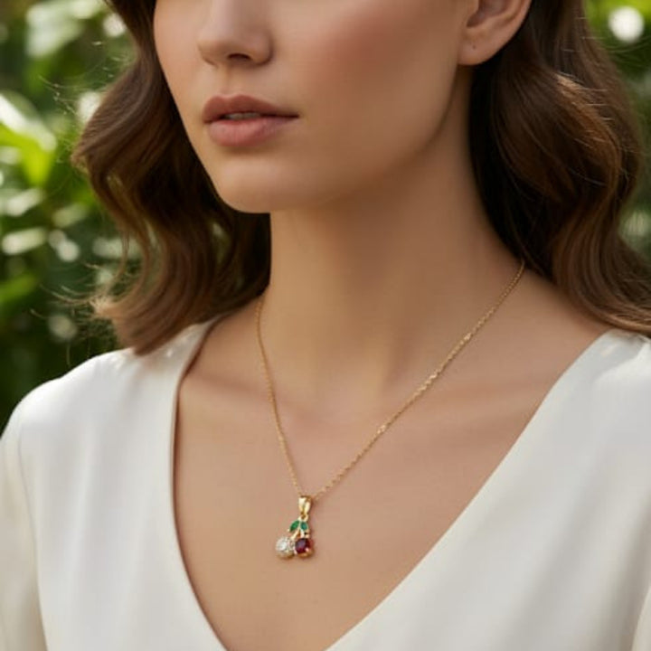 Cute Cherry Pendant Necklace with dual red crystal cherries and a gold-plated chain. A playful and stylish accessory perfect for casual wear or gifting. |