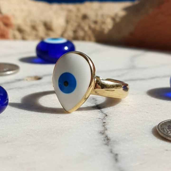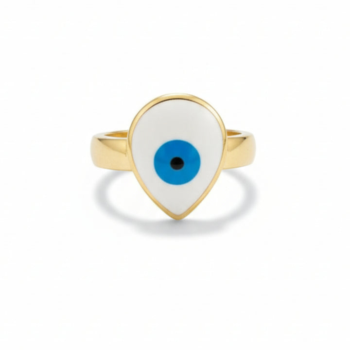 Protect yourself in style with the Evil Eye Ring. This beautifully crafted ring features the iconic evil eye motif, symbolizing protection and good luck. Lightweight and comfortable, it is perfect for everyday wear or layering with other rings. Makes a thoughtful gift for loved ones or a striking addition to your jewelry collection. |