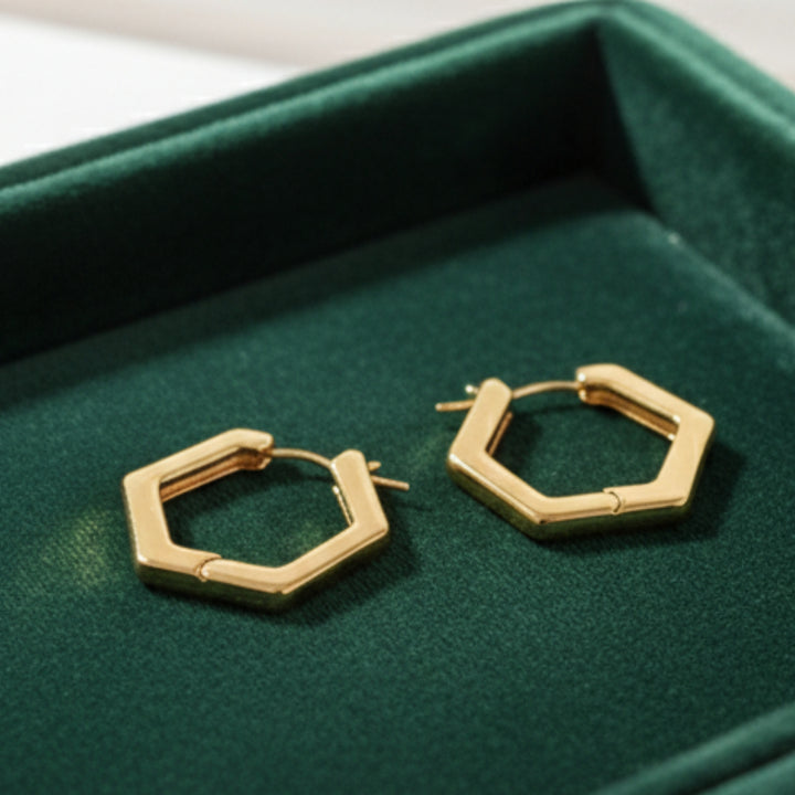 Make a statement with our Gold Hexagon Hoop Earrings. Crafted with precision, these geometric hoop earrings are lightweight, stylish, and perfect for both casual and formal occasions. Adds a modern twist to any outfit. |