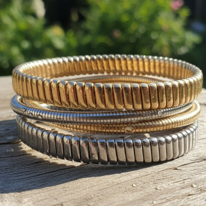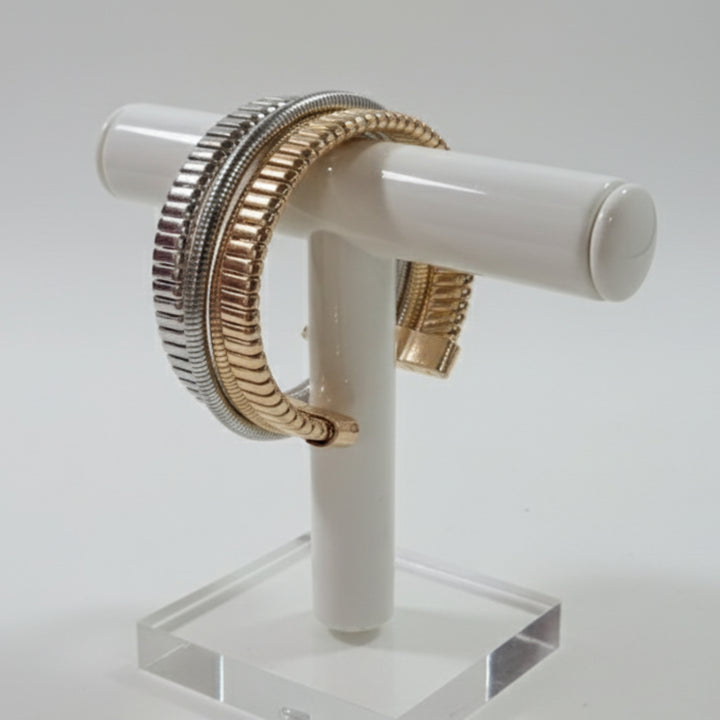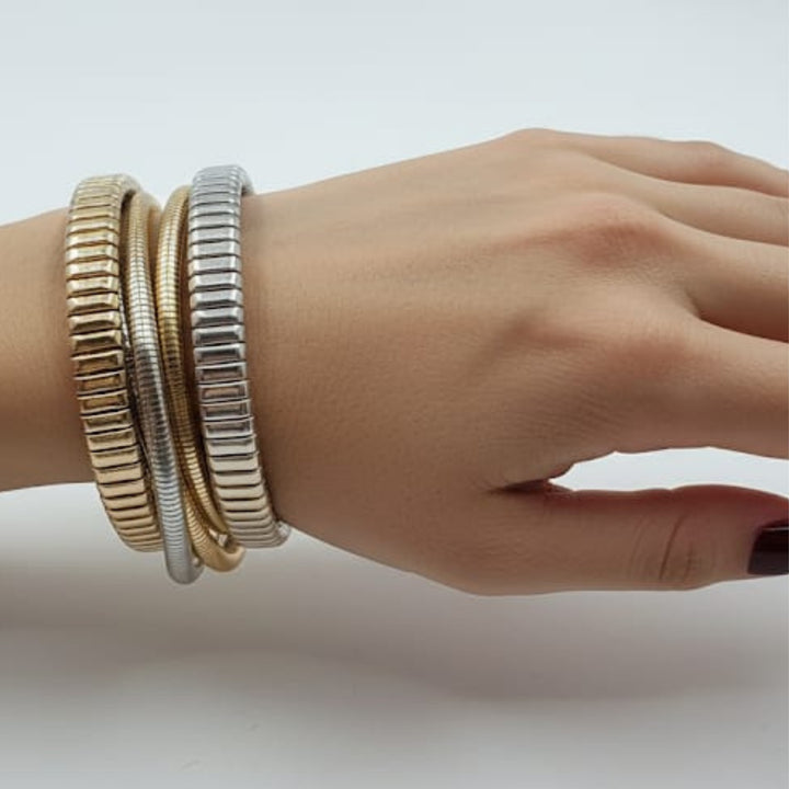Sleek Two-Tone Snake Chain Bracelet featuring a blend of gold and silver tones for a modern, elegant look. Perfect for stacking or solo wear. |