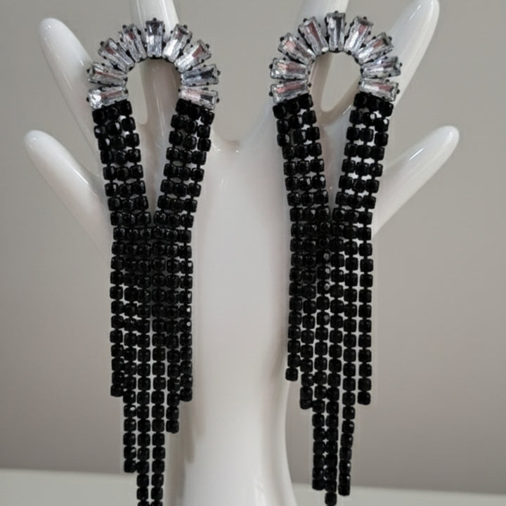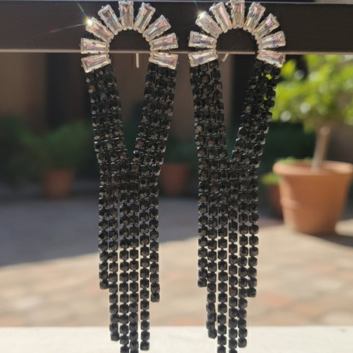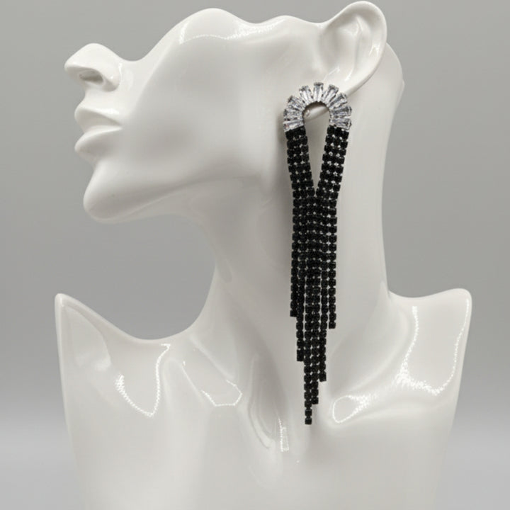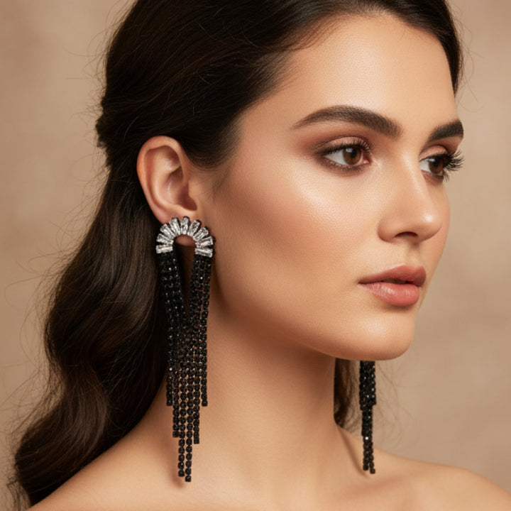 Add bold sophistication to your look with the U-Shaped Black Chain Drop Earrings. Featuring a sleek U-shaped design with dangling black chains, these earrings are lightweight, modern, and perfect for parties, evenings out, or statement styling. |